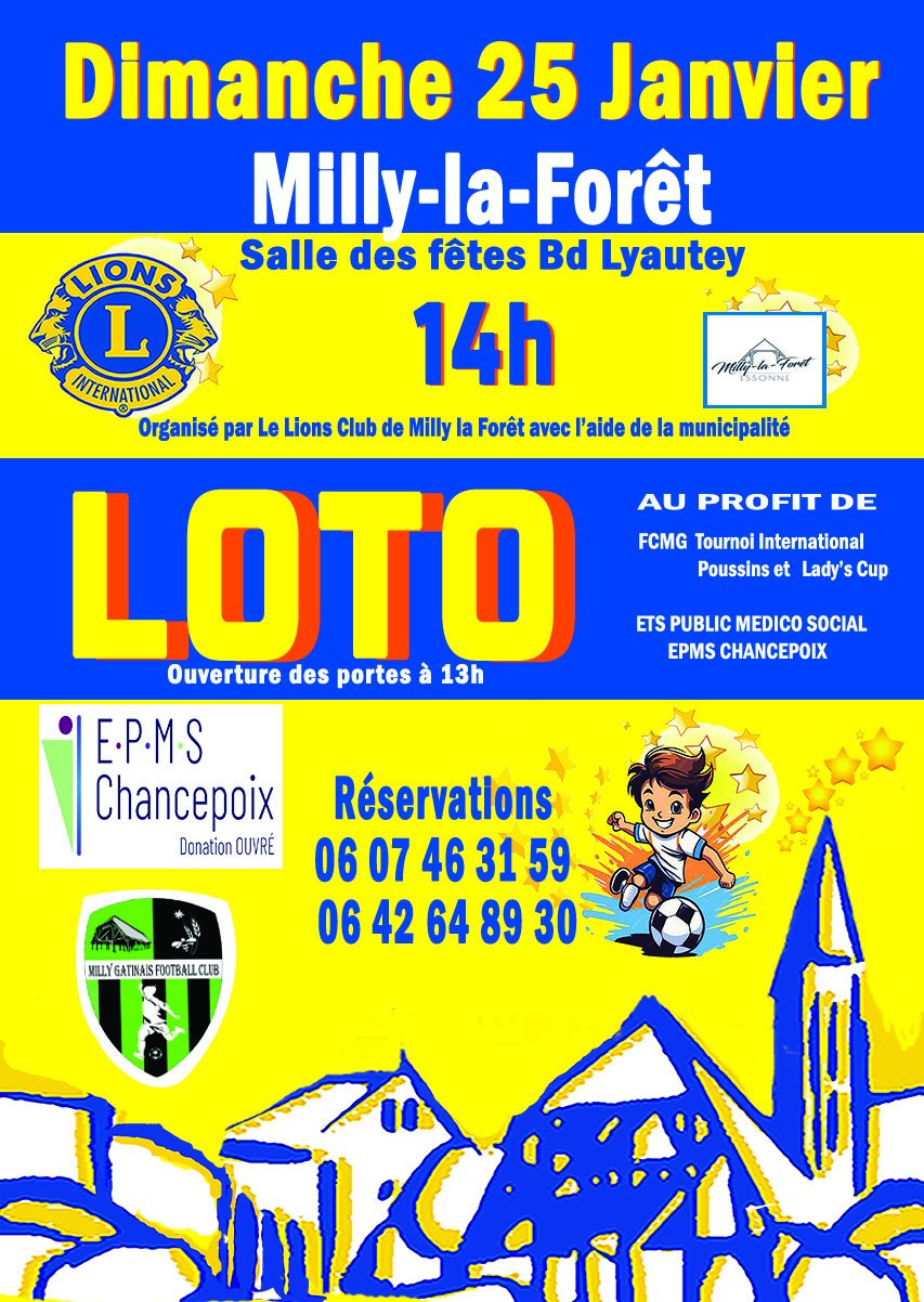 Participez à un loto solidaire, organisé au bénéfice de l’établissement public médico-légal de Chancepoix, qui accueille des enfants malades et du Football Club Milly Gatinais, pour ses actions en faveur de la jeunesse, notamment le tournoi international poussins et la Lady’s Cup.