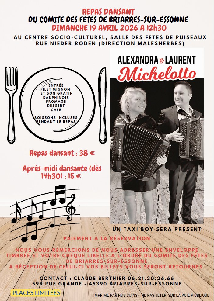 LE COMITE DES FETES DE BRIARRES-SUR-ESSONNE ORGANISE UN REPAS DANSANT LE DIMANCHE 19 AVRIL 2026 A 12h30