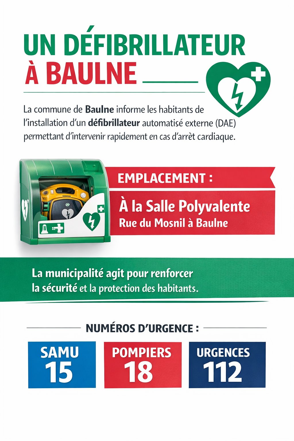 La commune de Baulne informe les habitants de lâinstallation dâun dĂ©fibrillateur automatisĂ© externe (DAE) permettant dâintervenir rapidement en cas dâarrĂȘt cardiaque.