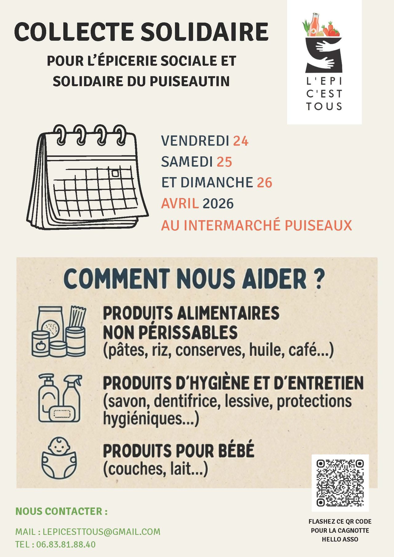 Les 24, 25 et 26 avril 2026, une collecte solidaire pour l'épicerie solidaire est organisée au magasin Intermarché de Puiseaux 🛒